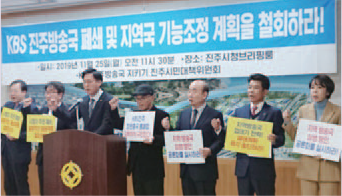 그동안 지역사회에서는 KBS 활성화를 위한 여러차례의 토론회를 개최했다. 그리고 지역방송 활성화를 요구했 다. 그러나 KBS진주방송국이 지역국 통폐합을 통한 일 방적인 구조조정의 대상에서 벗어나기는커녕, 사실상 지역국 폐쇄라는 최악의 상황을 맞이하고 있다.