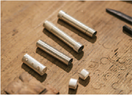 •칼집 작업과 같은 순서로 은으로 땜한 뒤, 쇳대에 끼워 칼집과 손잡이에 꼭 끼워지도록 늘이기 작업을 한다.